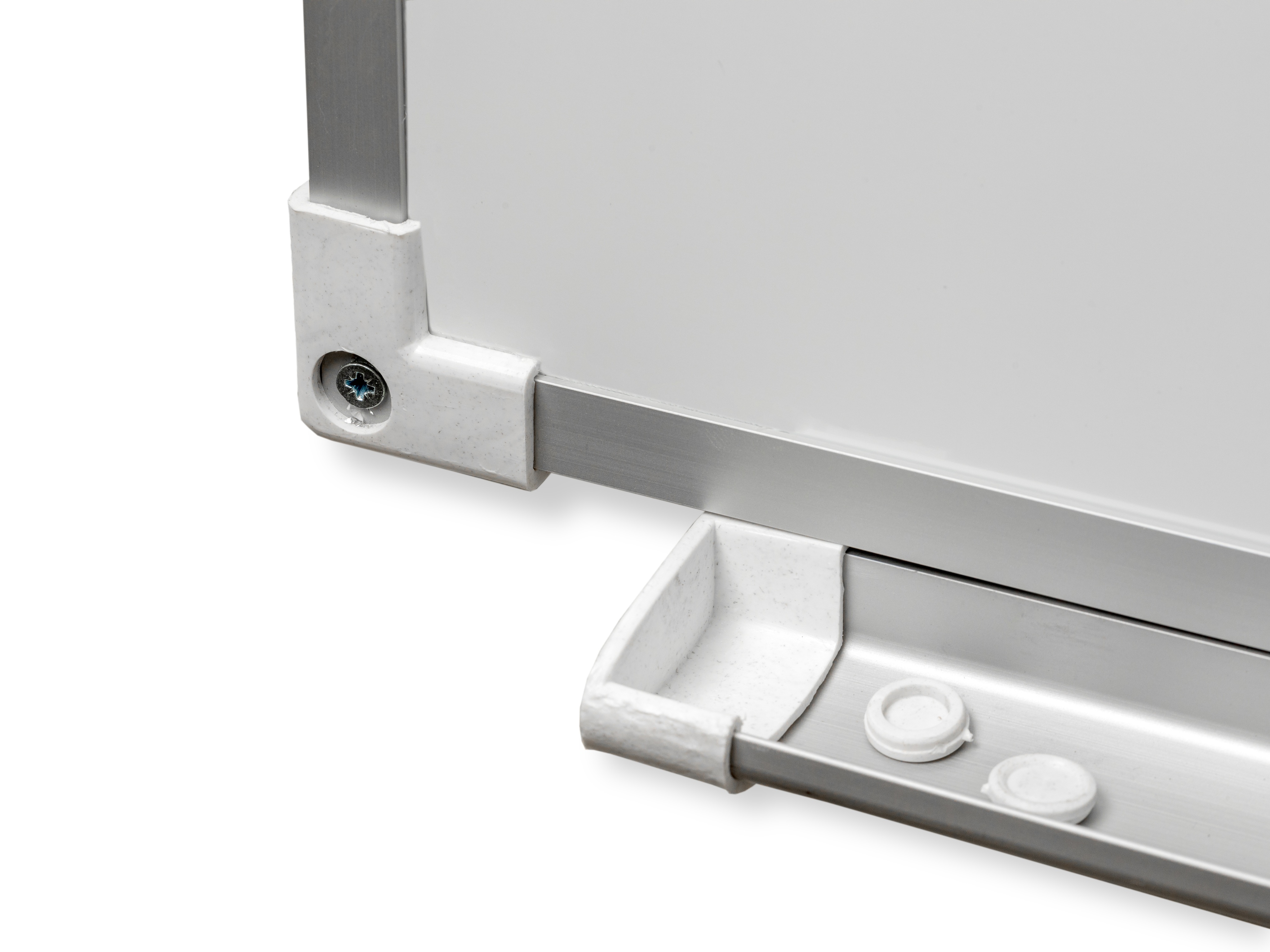 Рабочая поверхность изготовлена из полимерного листа, обрамление — высокопрочный алюминиевый профиль, благодаря чему имеет высокую износоустойчивость и прочность. Имеется лоток для мела/маркера и принадлежностей.