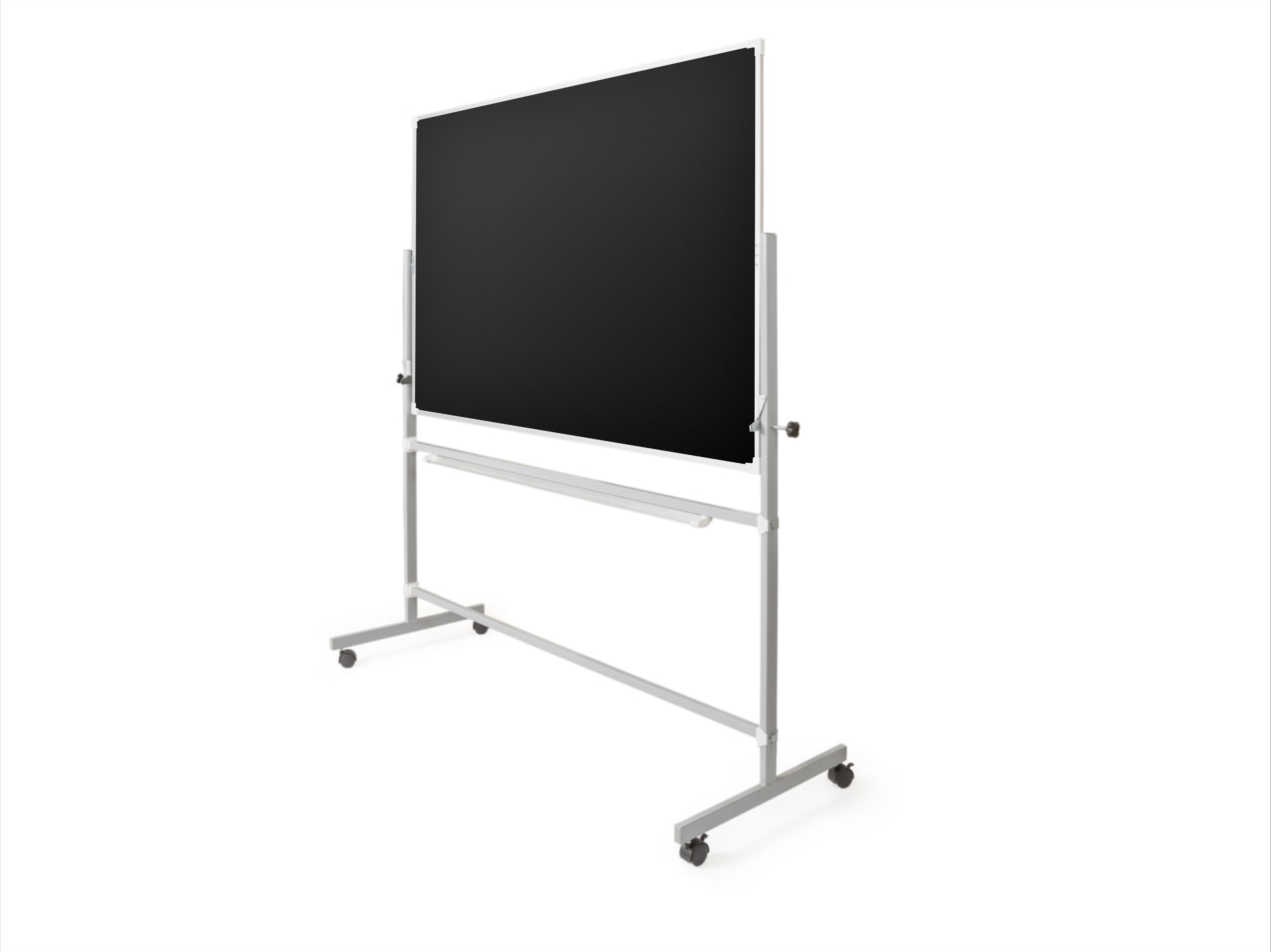 Передвижная поворотная доска установлена на металлической стойке, позволяющей ей поворачиваться вокруг горизонтальной оси. Две рабочие поверхности — из стального полимерного листа с антибликовым покрытие. Обрамление доски — высокопрочный алюминиевый профиль, благодаря чему имеет высокую износоустойчивость и прочность. Вы также можете размещать дополнительные наглядные материалы, плакаты и использовать доску в качестве экрана для проектора. Имеется лоток для мела/маркеров и принадлежностей.