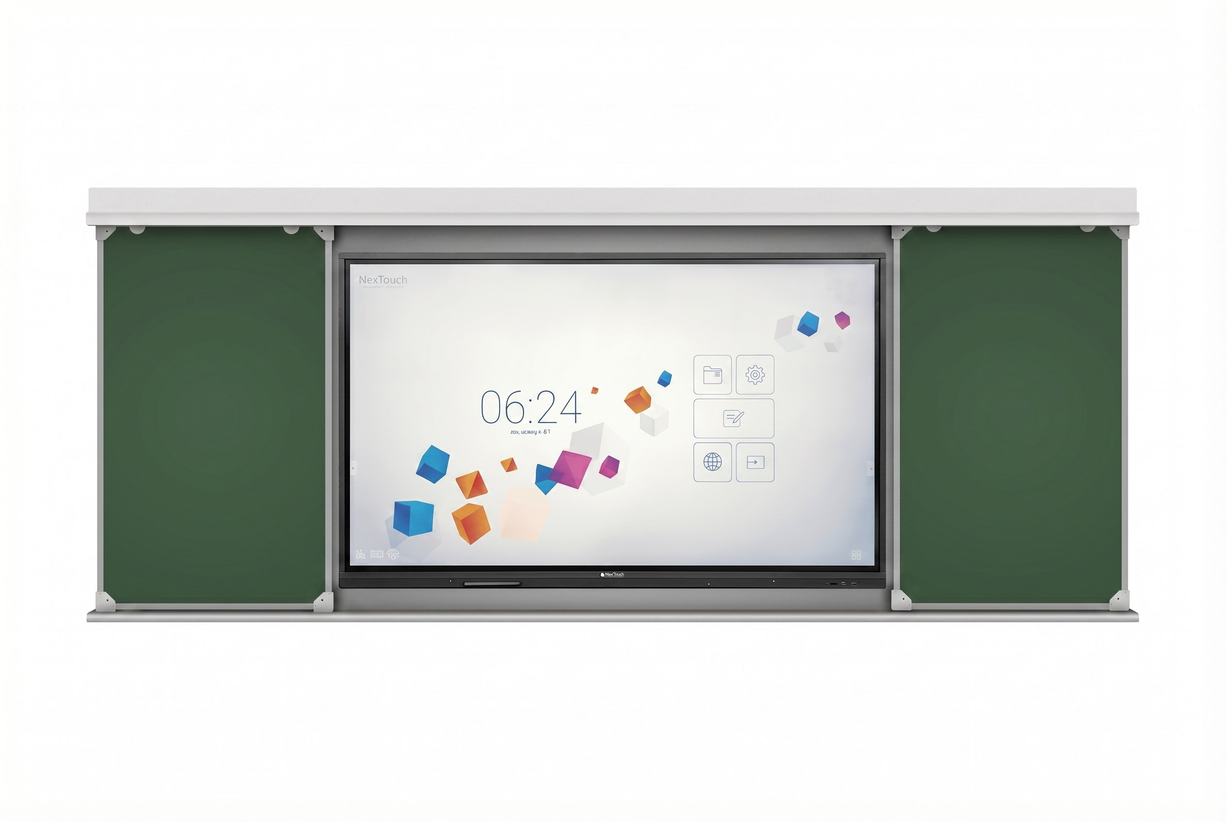 Функционально состоит из 4-х поверхностей для писания мелом, две из которых свободно перемещаются по рельсовой системе, закрывая интерактивную доску, встроенную в центр рельсовой системы.