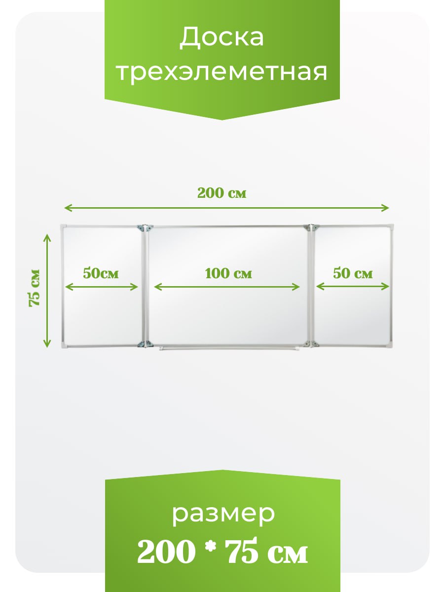 Рабочая поверхность изготовлена из стального полимерного листа, обрамление — высокопрочный алюминиевый профиль, благодаря чему доска имеет высокую износоустойчивость, прочность и надежность конструкции.  1-й элемент это центральная часть школьной доски, которая крепится к стене, а створки (2-й и 3-й элементы), могут независимо открываться и закрываться от плоскости центральной части доски до плоскости стены. Петли многоэлементных досок рассчитаны на нагрузку свыше 100 кг.  Имеется лоток для мела/маркера и принадлежностей.