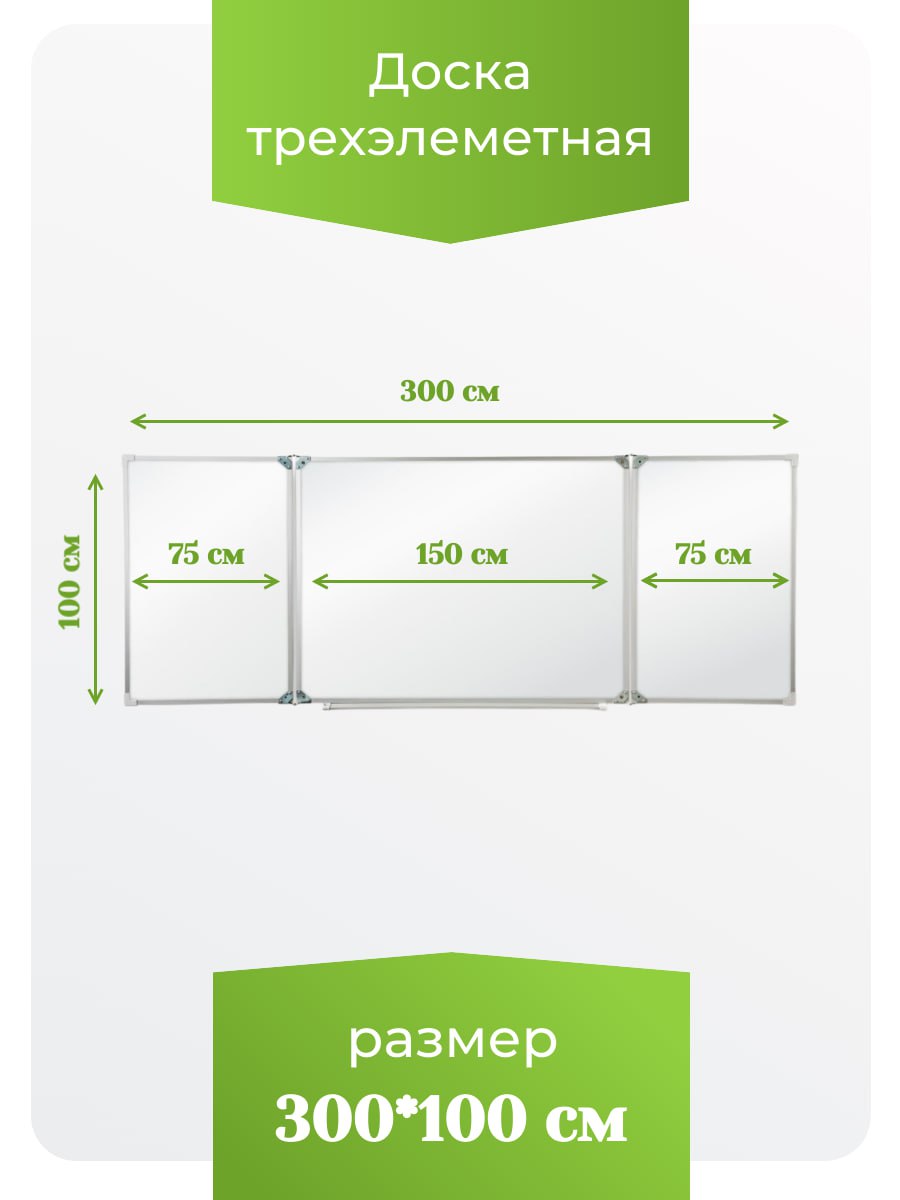 Рабочая поверхность изготовлена из стального полимерного листа, обрамление — высокопрочный алюминиевый профиль, благодаря чему доска имеет высокую износоустойчивость, прочность и надежность конструкции. 1-й элемент это центральная часть школьной доски, которая крепится к стене, а створки (2-й и 3-й элементы), могут независимо открываться и закрываться от плоскости центральной части доски до плоскости стены. Петли многоэлементных досок рассчитаны на нагрузку свыше 100 кг. Имеется лоток для мела/маркера и принадлежностей.