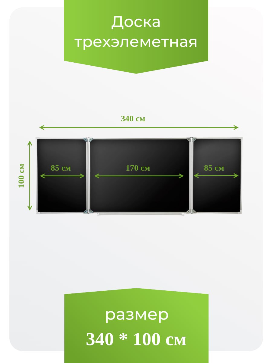 Рабочая поверхность изготовлена из полимерного листа высочайшего качества, обрамление — высокопрочный алюминиевый профиль, благодаря чему доска имеет высокую износоустойчивость, прочность и надежность конструкции. 1-й элемент это центральная часть школьной доски, которая крепится к стене, а створки (2-й и 3-й элементы), могут независимо открываться и закрываться от плоскости центральной части доски до плоскости стены. Петли многоэлементных досок рассчитаны на нагрузку свыше 100 кг. Имеется лоток для мела/маркера и принадлежностей.