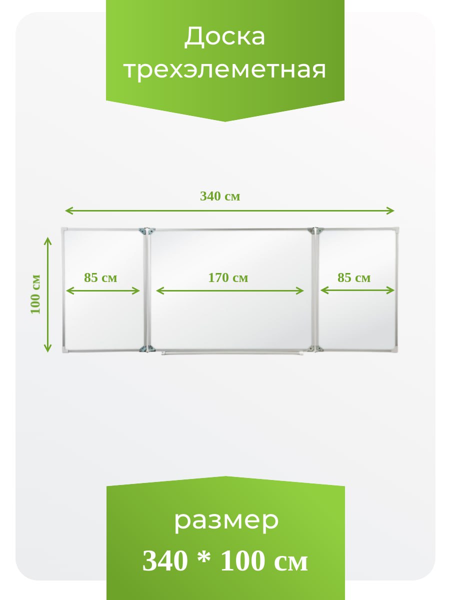 Рабочая поверхность изготовлена из стального полимерного листа, обрамление — высокопрочный алюминиевый профиль, благодаря чему доска имеет высокую износоустойчивость, прочность и надежность конструкции. 1-й элемент это центральная часть школьной доски, которая крепится к стене, а створки (2-й и 3-й элементы), могут независимо открываться и закрываться от плоскости центральной части доски до плоскости стены. Петли многоэлементных досок рассчитаны на нагрузку свыше 100 кг. Имеется лоток для мела/маркера и принадлежностей.